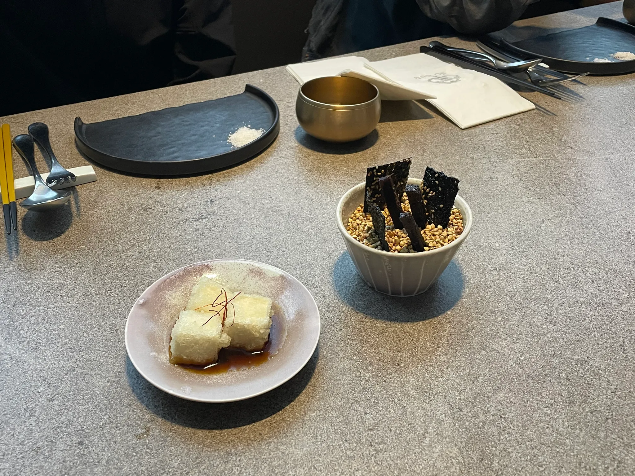 에피타이저로는 들기름 두부부침, 세워져 있는 것은 육포와 김부각을 주셨습니다.
