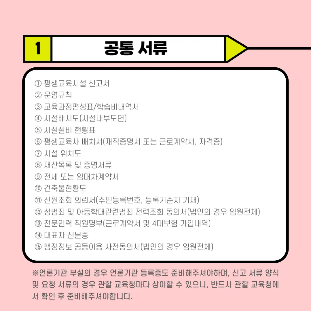 오늘은 언론기관 부설 평생교육시설 신고 시 어떤 서류가 필요한지에 대해 알아보겠습니다!!