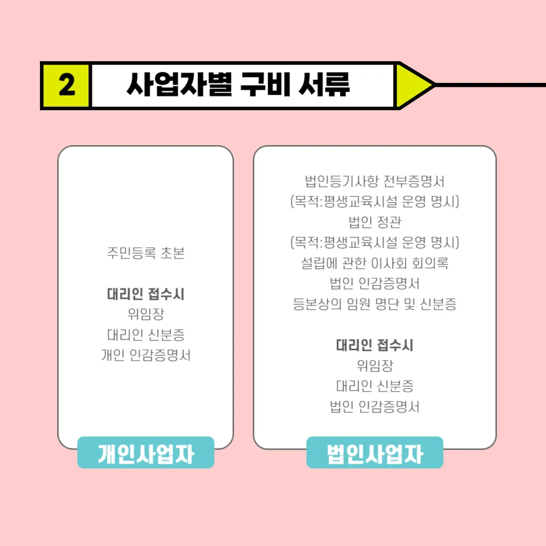개인과 법인사업자에 따라 교육청에 제출할 서류 목록이 다르기 때문에 필요 서류를 꼭 확인 후 준비해 주셔야 합니다.