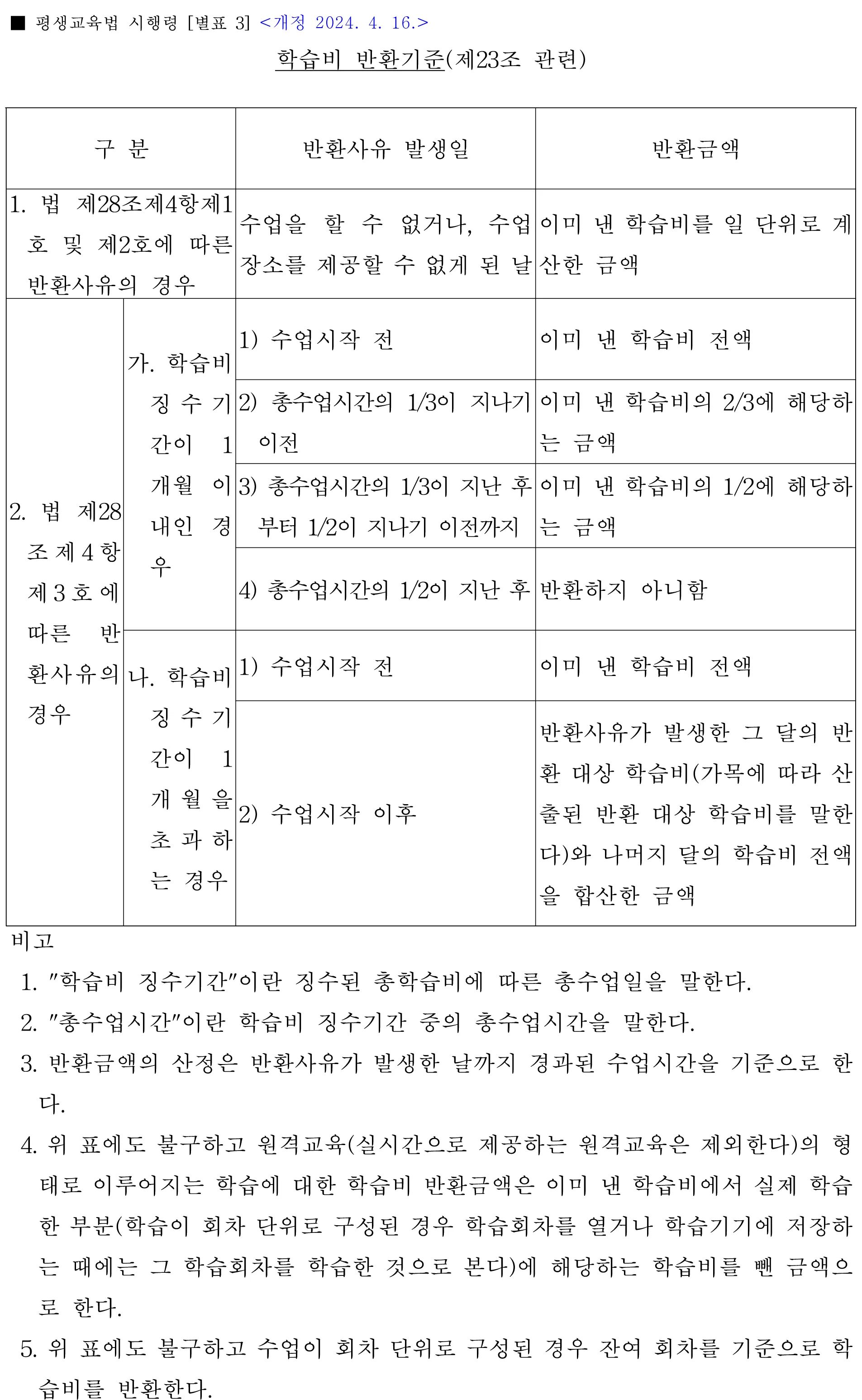 평생교육법 시행령 개정에 따른 학습비 반환기준 안내('24.4.19.시행)